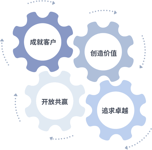成就客户是一切决策的出发点,,,,创造价值是衡量所有工作的标准,,,,追求卓越是我们做事做人的态度,,开放共赢是我们的格局也是最终的结果。。。价值观的齿轮环环相扣,,,推动着组织里的每个人不断向前。。